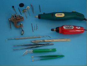 Z narzędzi które wykorzystuję warto chyba tylko wymienić te najistotniejsze, całą resztę każdy dobiera wg. własnych upodobań: wiertarki, pilniki iglaki (polecam jubilerskie), frezy, wiertła (od. 0,5 mm), papiery ścierne (400-2500), pęsety, klamerki, taśmy maskujące, nożyki, itd. Itd.